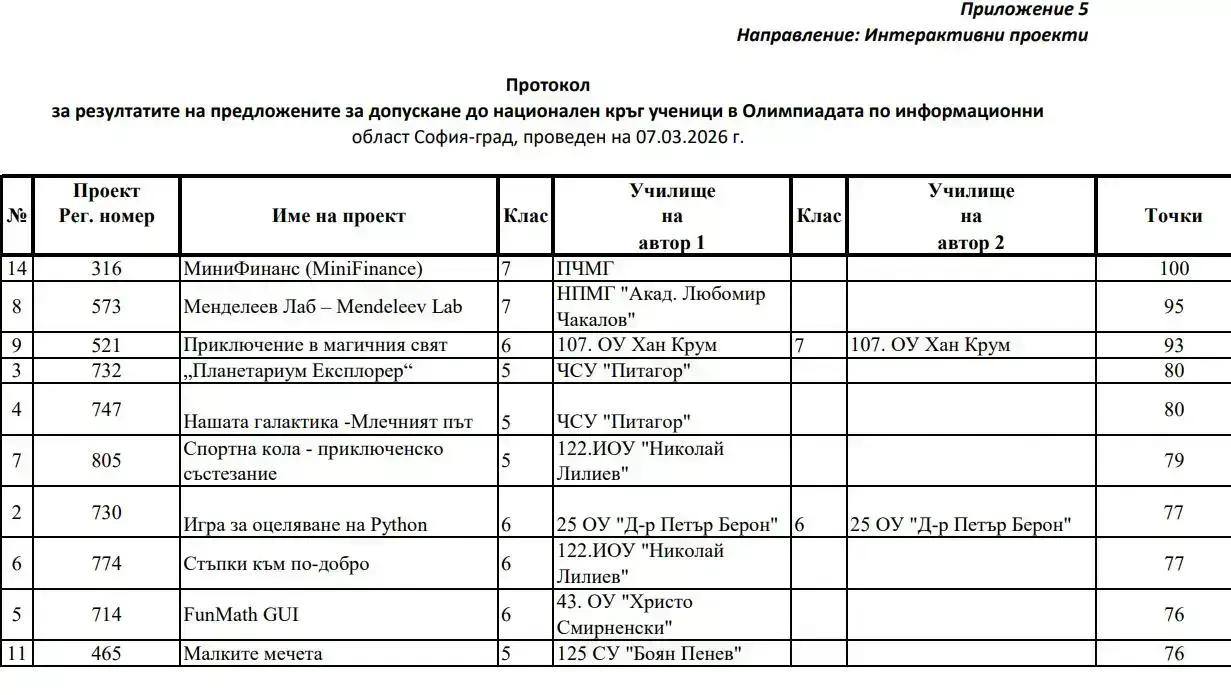 - Стефания Петрова от 7. А клас участва в категория "Интерактивни проекти“ с проекта „Приключение в магичния свят“ и получи 93 точки, което ѝ донесе предложение за участие в националния кръг.